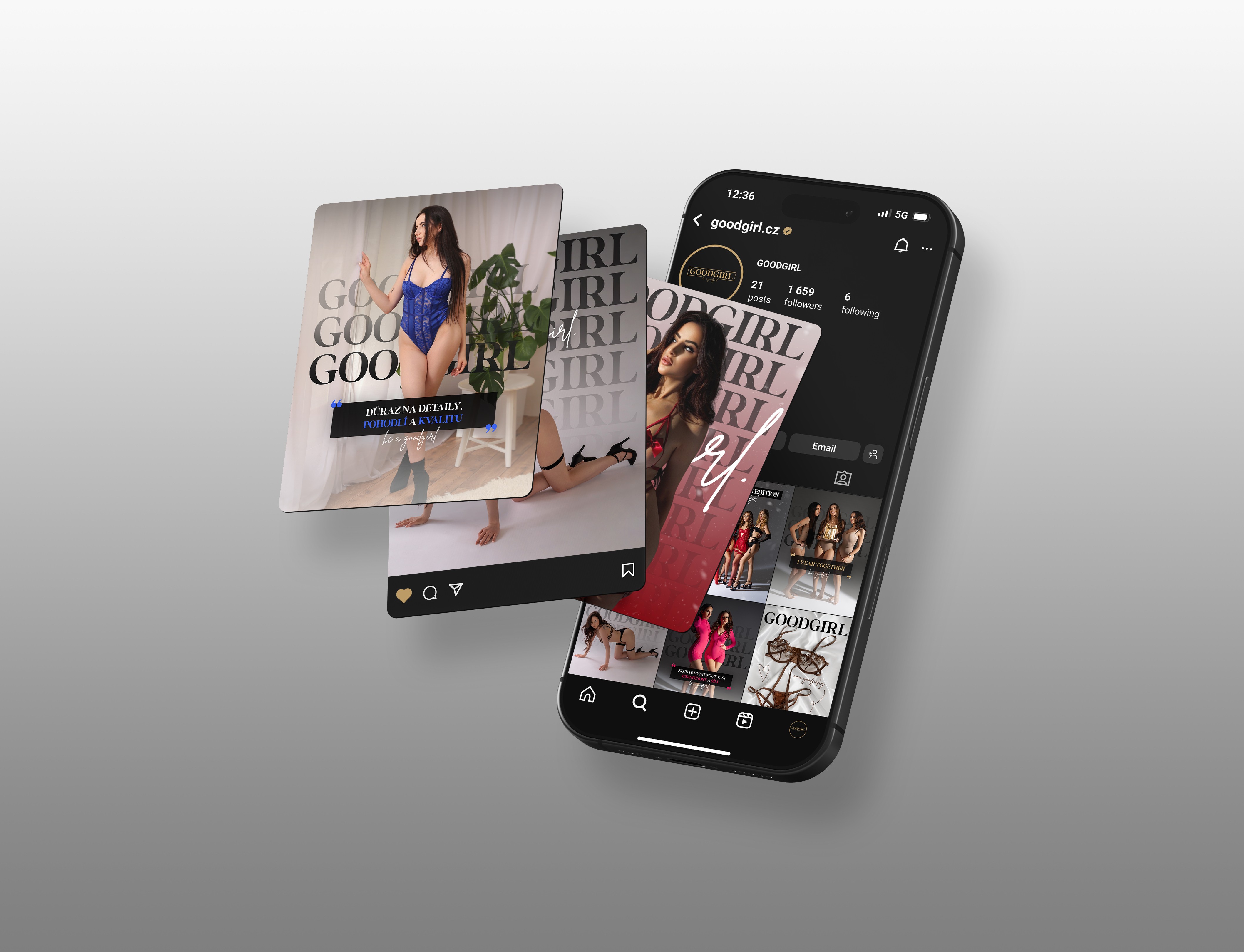 The wordmark ‘GOODGIRL’ is crafted in a strong serif typeface, symbolizing confidence, strength, and sophistication. Its bold presence conveys luxury while remaining elegant and approachable. The addition of the handwritten tagline “be a goodgirl” introduces a contrasting element of femininity, intimacy, and playfulness, softening the overall design and reinforcing the brand’s personal connection with women. The gold color palette represents luxury, exclusivity, and timeless beauty, while also evoking sensuality and empowerment. Combined with the deep black background, the design achieves a premium contrast that highlights both sophistication and intimacy – essential qualities for a high-end lingerie brand.