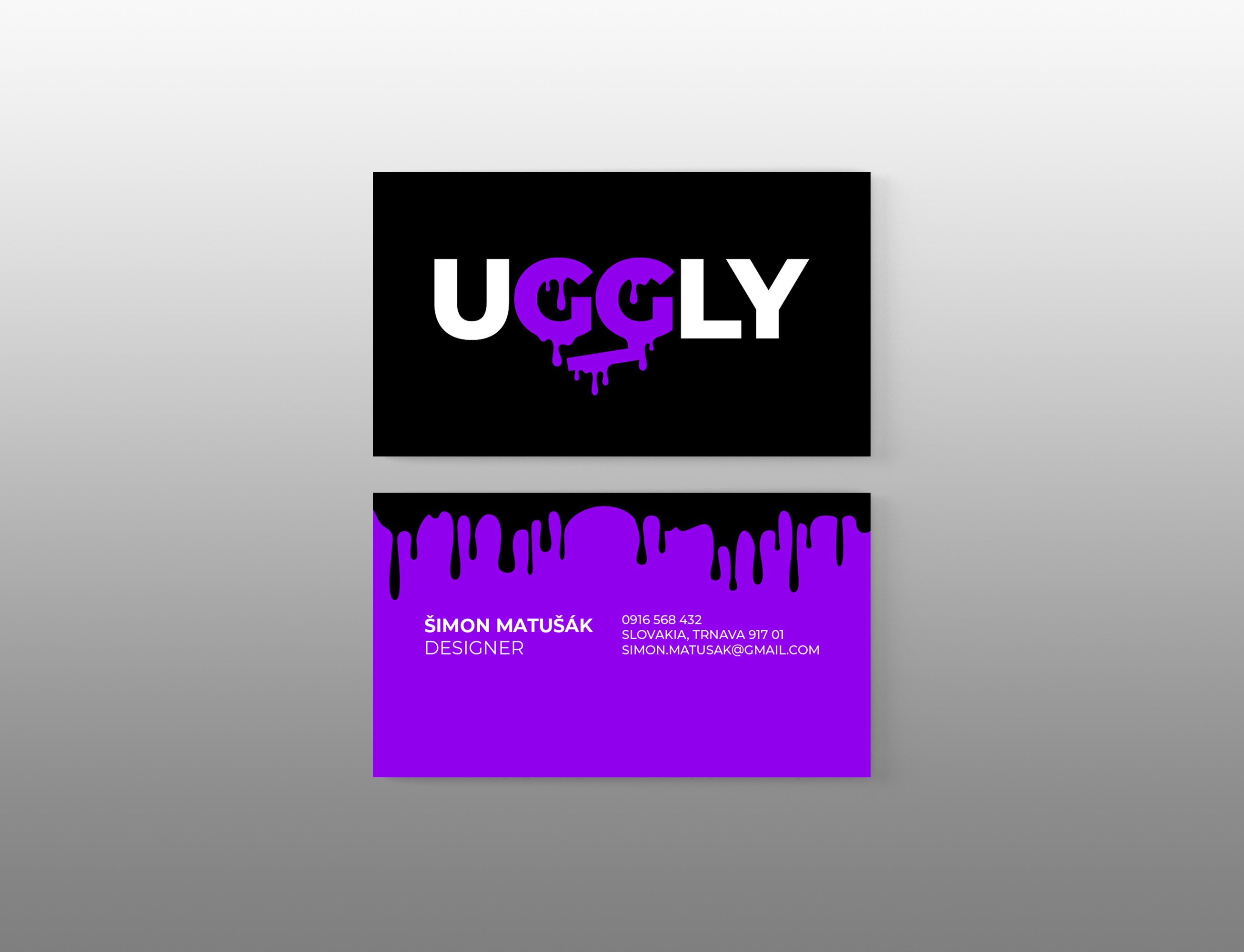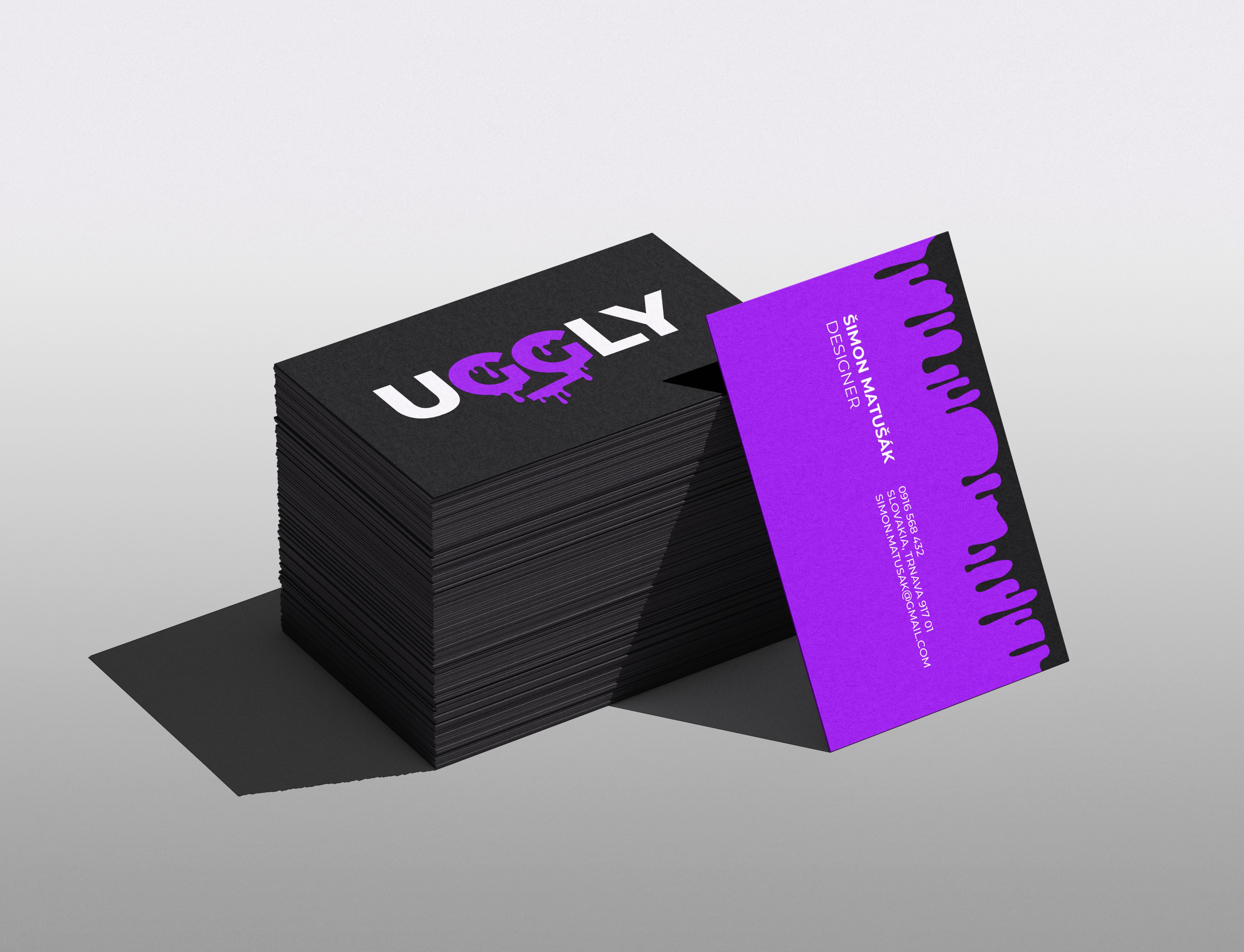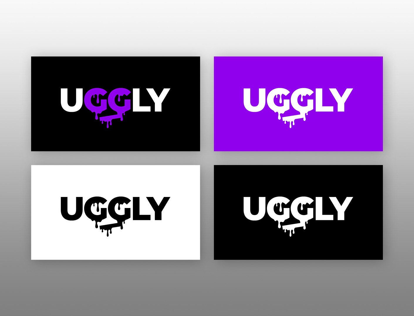 The purple color enhances this identity, representing mystery, individuality, and creativity, while also carrying a melancholic, sad undertone. This dual nature contributes to the emotional depth and atmosphere of the brand, reinforcing the message of finding beauty in imperfection and darkness. In contrast, the black-and-white variations ensure versatility and boldness across different applications. Altogether, the logo becomes more than just a wordmark – it is a visual attitude. It embodies imperfection, rebellion, sadness, and authenticity, making “UGGLY” a proud statement of street identity, emotional depth, and raw style.